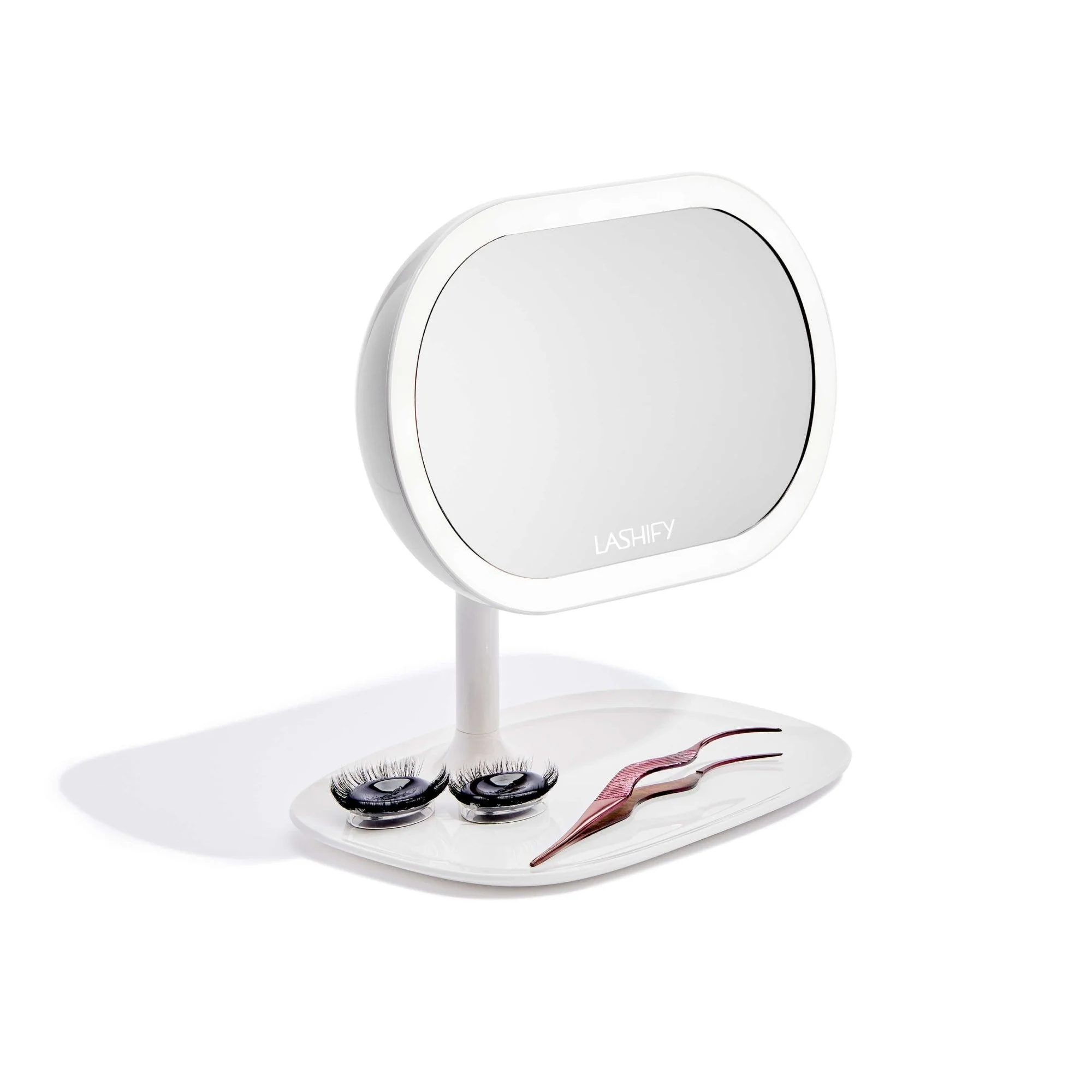 As for the base? That’s not just to keep your mirror upright or turn it into a table lamp. It’s actually a tray specifically designed to hold all your lash necessities: Gossamers®, your Fuse Control® Wand, bonds, sealers, and so on. Whatever you need for your lash session, your tray will keep nice and tidy for you while the mirror provides its signature lighting effects.